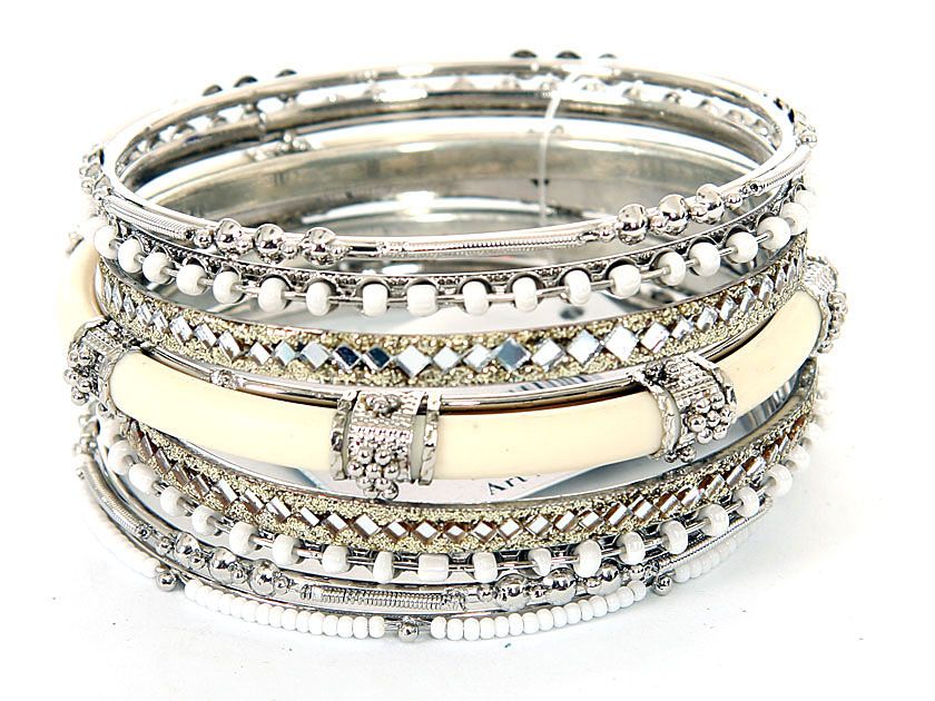 Beautiful & trendy 8 pieces fashion bangles set has white beads 3 thin bangles, 2 mirror pattern bangles, 2 metal patterned bangles & one ivory resin bangle inside a metal frame. This bangle set can be matched with any kind of casual or formal outfit.