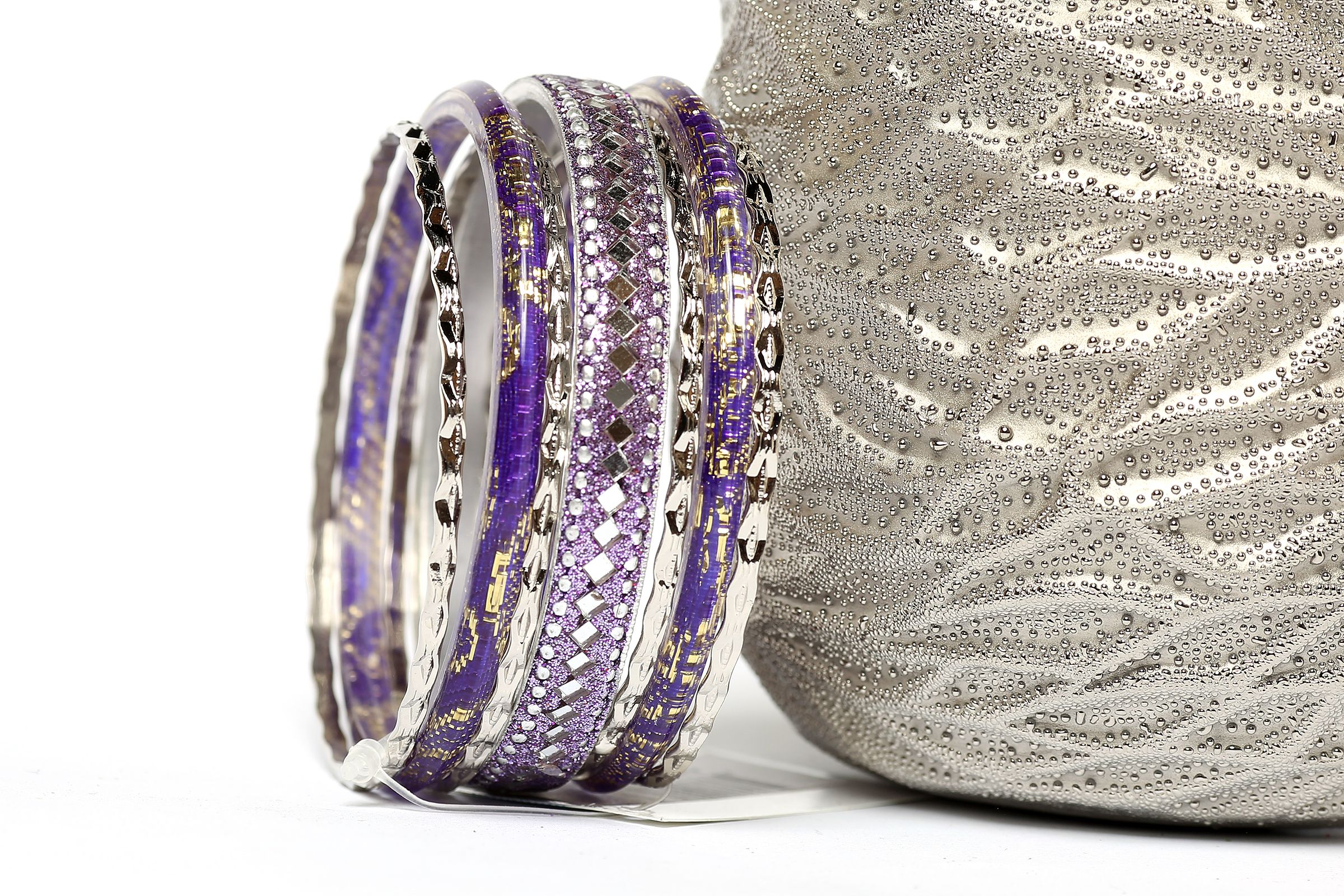 Shiny & Glittery seven piece set of fashion bangles in purple hues includes one wide bangle in Aluminium with mirrors design on it, 2 resin bangles with gold glitter inside them & 4 thin silver bangles. Hand crafted in India.
