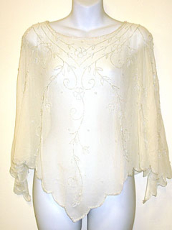 100% rayon poncho top with same colored stems with flowers beaded pattern. Boat neck poncho has beaded neckline and borders also.