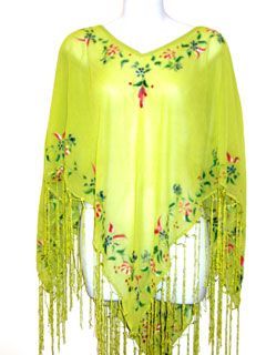 100% Rayon Material Poncho Top with Painted flowers around its neckline and borders and also shiny long hanging thread fringes along its border. Imported.