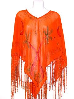 100% rayon material broad v-neck poncho top in orange color with painted palm trees. Long satin threads like hanging fringes on its border. Imported.