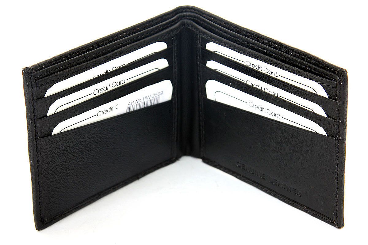 Carry your money in style. This is a genuine leather bifold double bill mens wallet. The wallet is made of lamb skin. As this is genuine leather, please be aware that there will be some small creases and nicks in the leather but the wallet is all brand new.