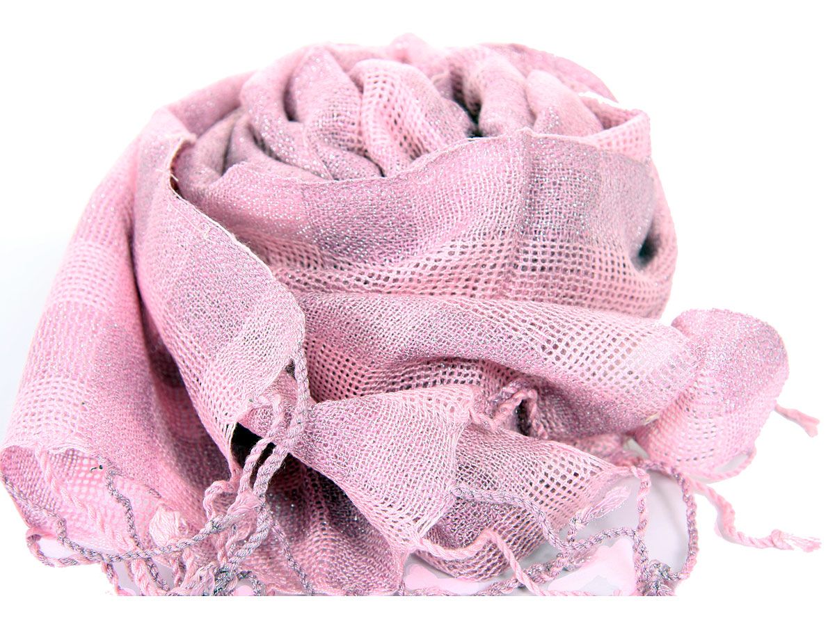 Shimmery pink colored yarn dyed viscose scarf in open weave pattern. Broad striped pattern in same color. Made of 95% viscose and 5% metallic. Imported.