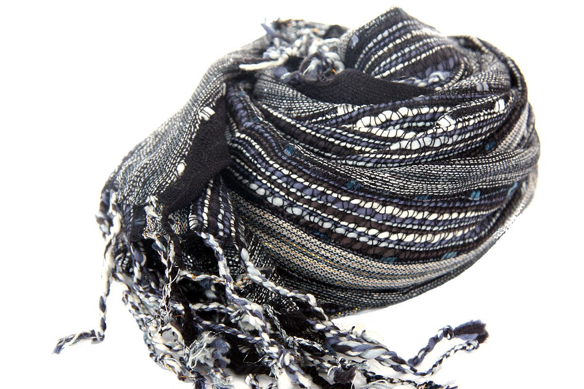 Beautiful black and multi colored design scarf has horizontal open weave pattern. Long twisted fringes completes this 100% viscose scarf. Classy scarf can also be teamed up with a formal dress as a shawl. Imported.