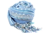 Beautiful light blue and multi colored design scarf has horizontal open weave pattern. Long twisted fringes completes this 100% viscose scarf. Classy scarf can also be teamed up with a formal dress as a shawl. Imported.