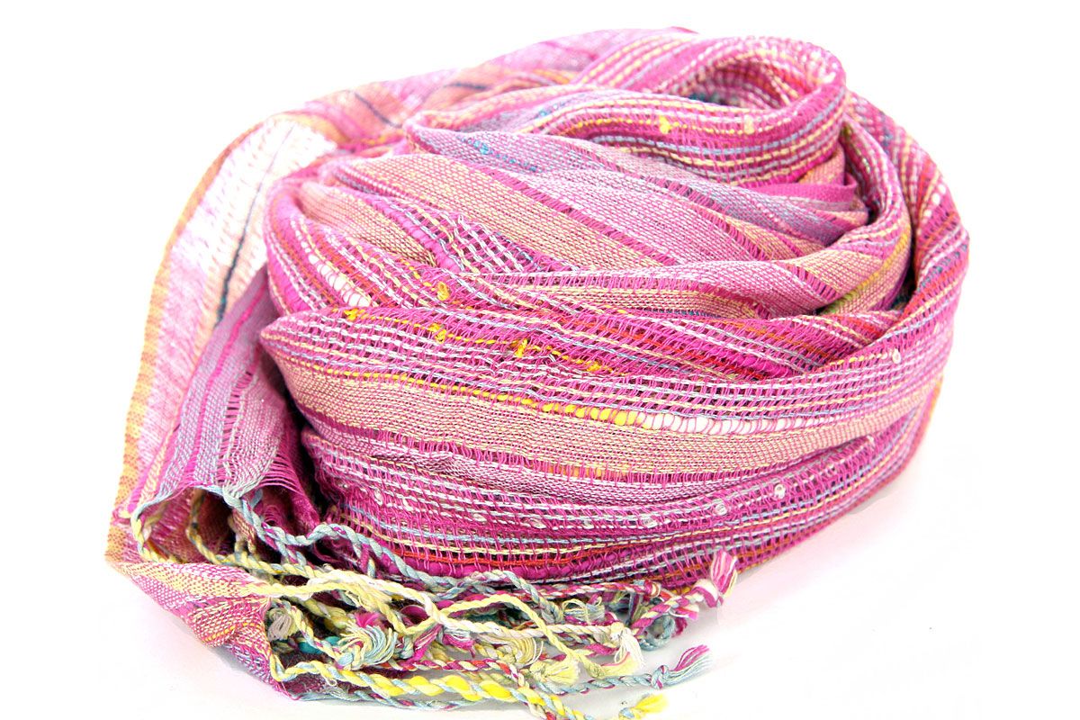 Beautiful pink and multi colored design scarf has horizontal open weave pattern. Long twisted fringes completes this 100% viscose scarf. Classy scarf can also be teamed up with a formal dress as a shawl. Imported.