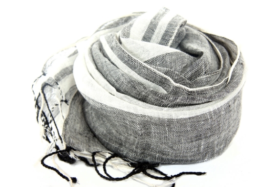 Vertical Stripes in different sizes pattern over this 100% linen scarf which is little stiff & semi-sheer. Black color is woven into white & twisted fringes on the ends of the scarf. Imported.