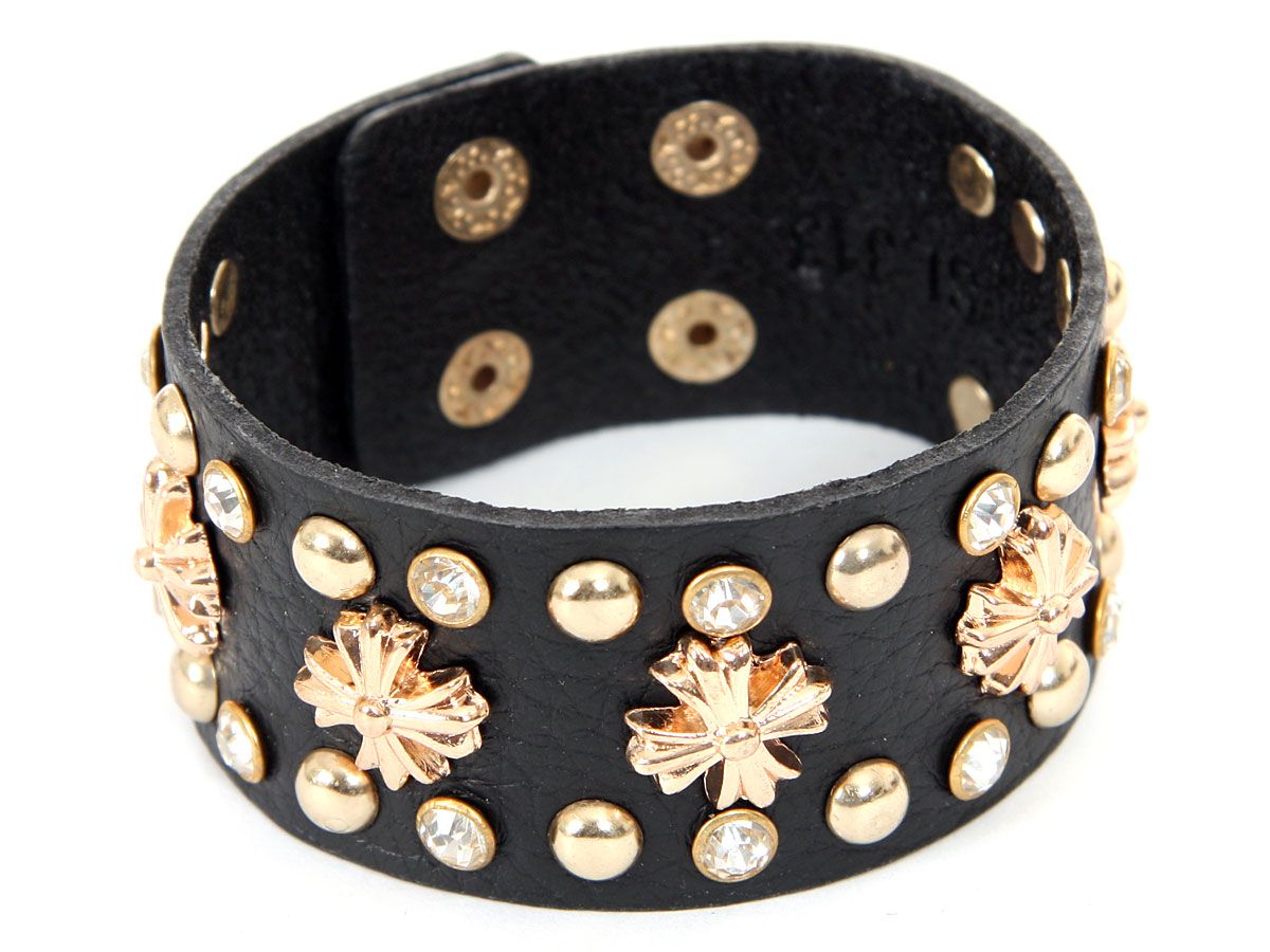 Genuine Leather Studded Wide Cuff Fashion Bracelet with button closure. Small buttons & cross shape studs makes this bracelet to be matched with any kind of outfit.