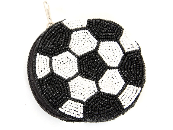Beaded coin purse in the shape and colors of a soccer ball. Top zipper closure with wrist strap. Identical beading on both sides. Made of 100% Rayon with sequins and beads. Imported. Since this item is hand-beaded, the color or design may vary slightly.