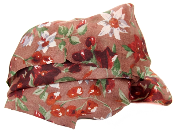 Multi colored floral print over mocha 100% silk scarf which is square shaped. Lightweight & soft in use. Made in India.