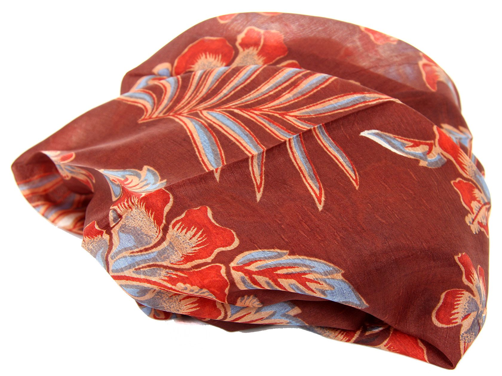 Floral print in multi colors blooms over this brown 100% silk scarf. Square shaped scarf can be used around the neck or head in any possible way. Made in India.