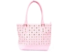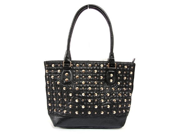Faux Leather Metal Eyelets studded double handle bag. Top zipper closing, center divider.