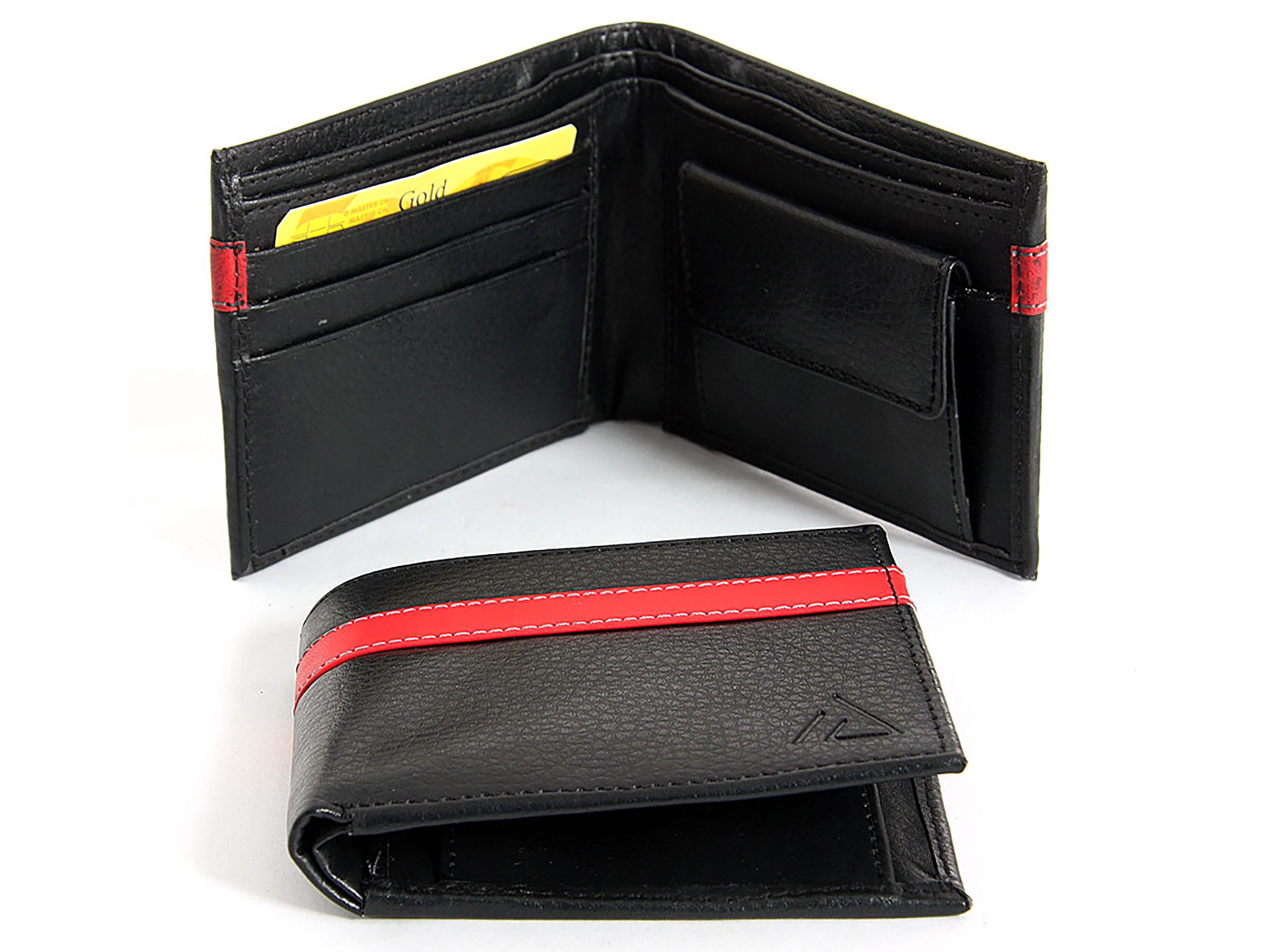 Carry your money in style. This is a faux leather bi-fold mens wallet. Features 3 credit card slots and a snap lock coin slot. As this is faux leather, please be aware that there will be some small creases and nicks in the leather but the wallet are all brand new.