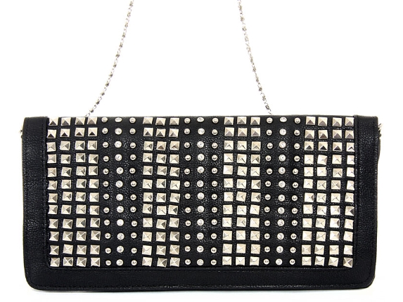 Faux leather folding studded clutch bag. Zipper closing inside the flap & back outside zipper pocket. Wrist strap and metal shoulder chain included.