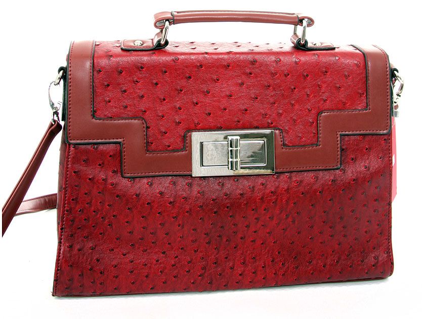 PVC box shaped ostrich embossed fashion handbag with twist lock. Top zipper closing and back zipper pocket.