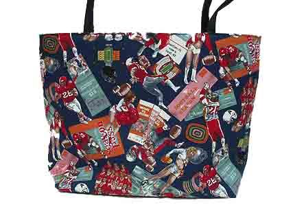 Bucket tote bag has a sports theme artwork pattern and a double handle.