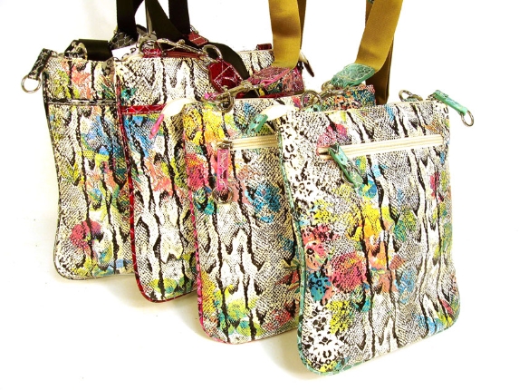 Snake print multi colored crossbody bag with strappy design in front and zipper closure at back. Bag has a solid colored detachable cross body strap. Made of PU (polyurethane).