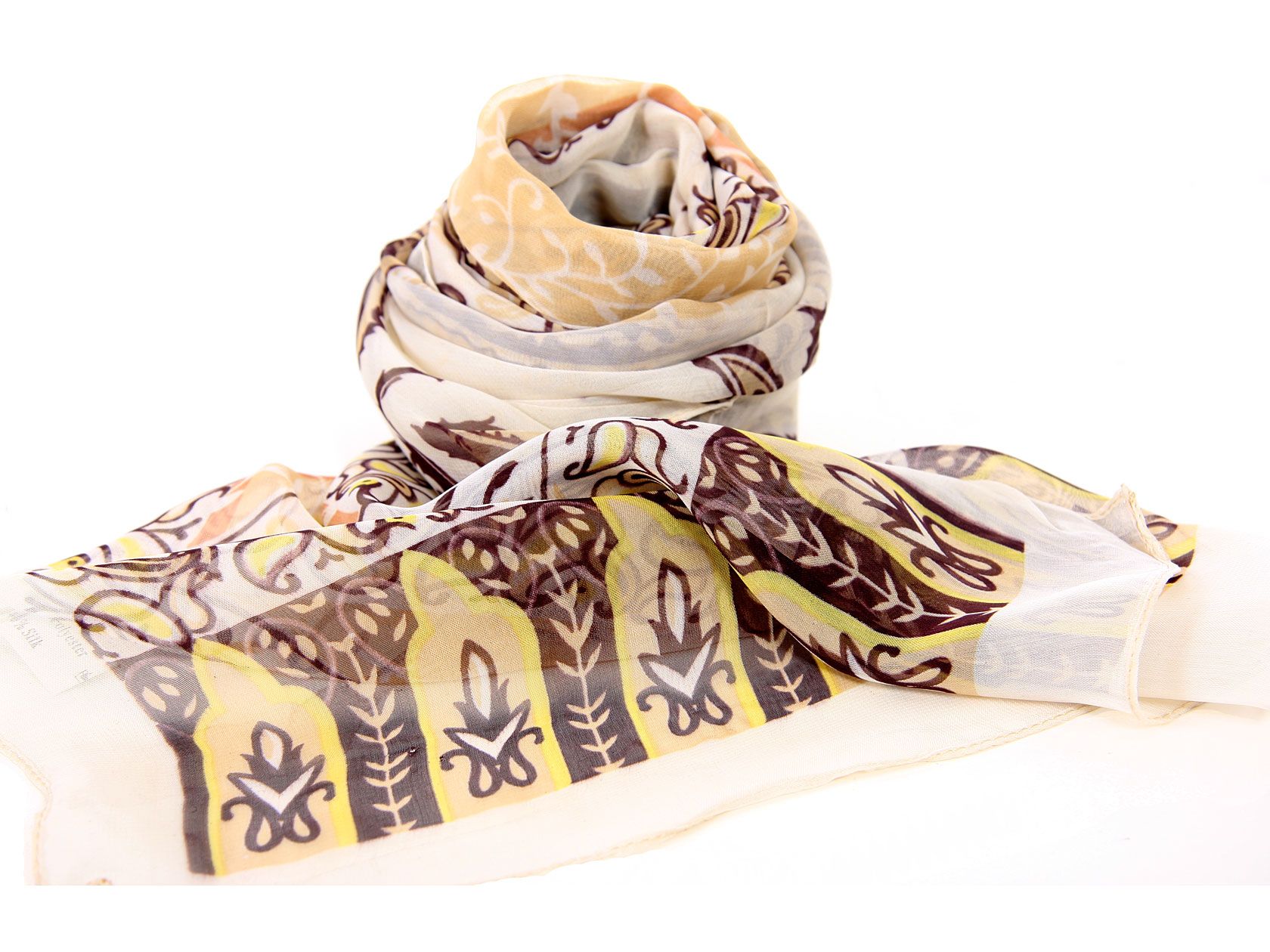 Beautiful printed scarf in beige with gold & coffee colored artistic pattern comprising of paisleys, leaves & flowers. Lightweight & matches with any kind of outfit. 60% polyester and 40% silk.