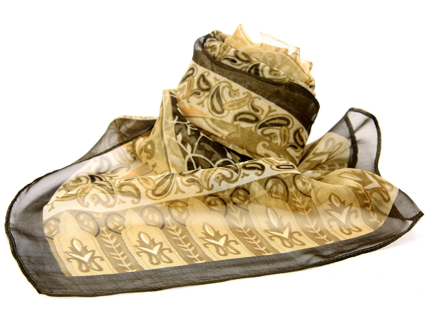 Beautiful printed scarf in hunter green with artistic pattern in gold color comprising of paisleys, leaves & flowers. Lightweight & matches with any kind of outfit. 60% polyester and 40% silk.