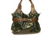 PVC fashion Handbag has a glossy texture, a double handle, a top zipper closure and a belt detail with a lobster claw closure.