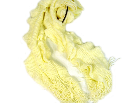 Ruffled ivory colored knitted scarf in acrylic material which is soft as well as lightweight. Fringes on the edges completes this scarf. Imported.
