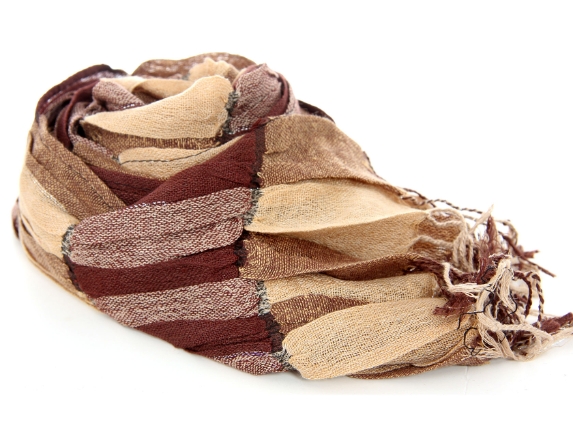 Checkered brown & tan 100% polyester woven scarf which is crinkled as well as stretchable. Silver lining running through the scarf vertically. Twisted fringes on its ends. Hand wash. Imported.