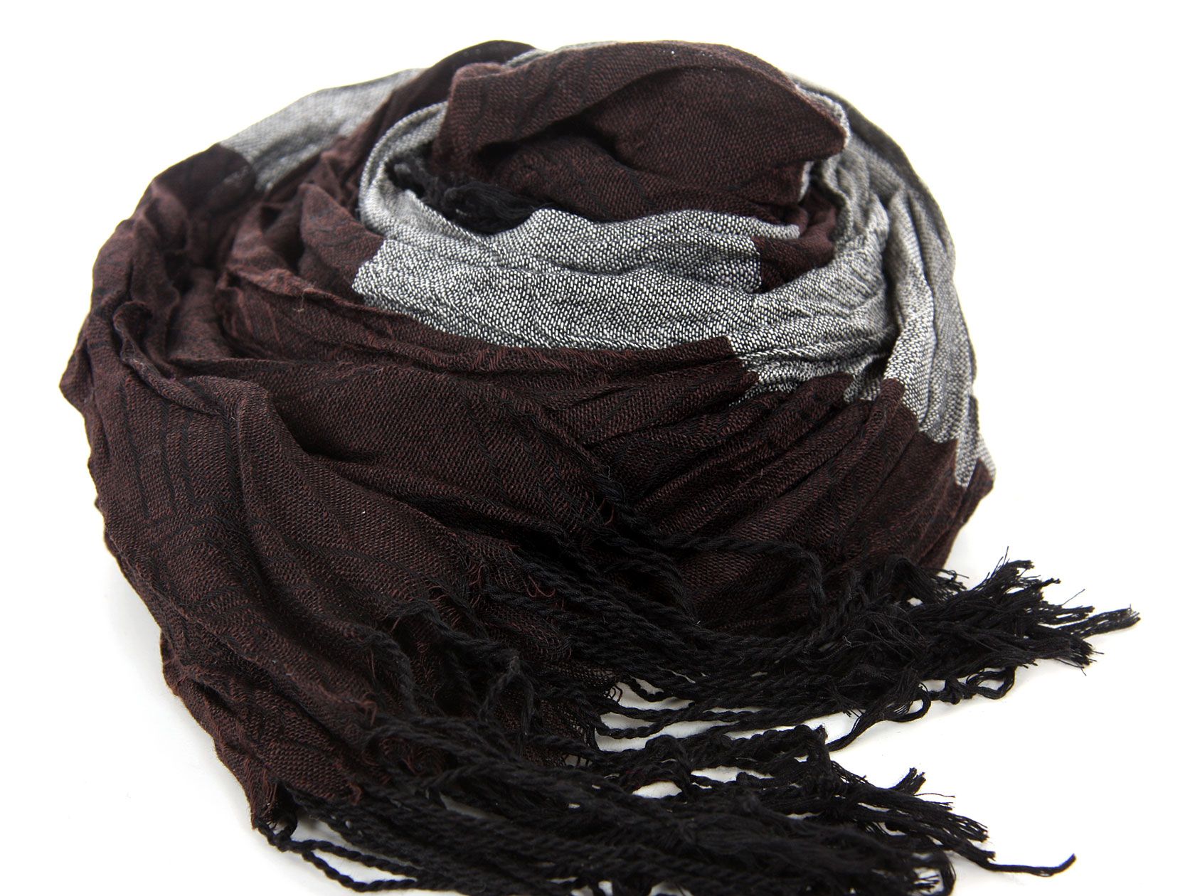 Crinkled Polyester Scarf with Alternating Coffee & Gray colors horizontally. Small diamond pattern all over it. Twisted long fringes in black on its ends. Can be teamed up with a formal or casual attire. Imported. Hand wash.