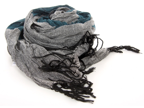 Crinkled Polyester Scarf with Alternating Teal & Gray colors horizontally. Small diamond pattern all over it. Twisted long fringes in black on its ends. Can be teamed up with a formal or casual attire. Imported. Hand wash.