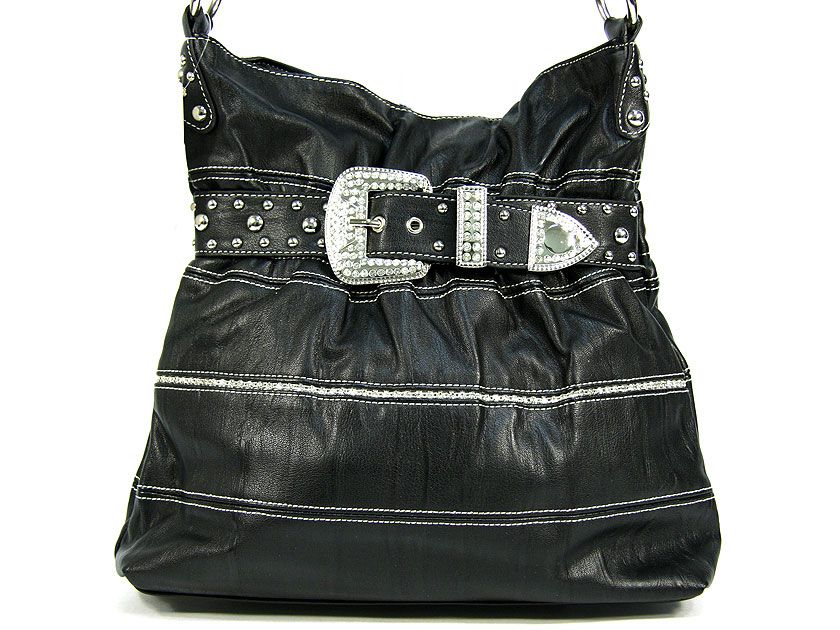 Rhinestones Buckle around the neck of this bag & also on the body of bag. Broad single shoulder strap. Imported.