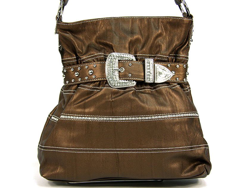 Rhinestones Belt Fashion Handbag has studded details, a top zipper closure and a single shoulder strap. Made of faux leather.