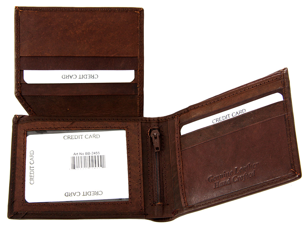 Carry your money in style. This is a genuine leather bi-fold double bill mens wallet. This wallet has 7 credit card slots, 2 ID windows and 1 center zippered pocket. There is a left lift-up flap. As this is genuine leather, please be aware that there will be some small creases and nicks in the leather but the wallet are all brand new.