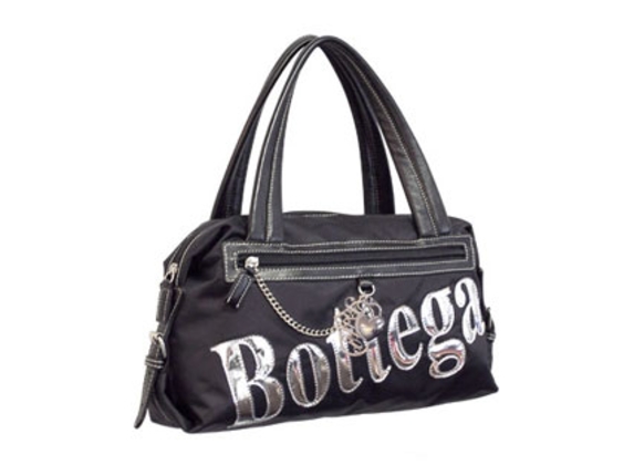 Trendy Handbag has a metallic logo design, a top zipper closure, a double handle, and outside pocket with zipper closure and chain detial. Made of Nylon material.