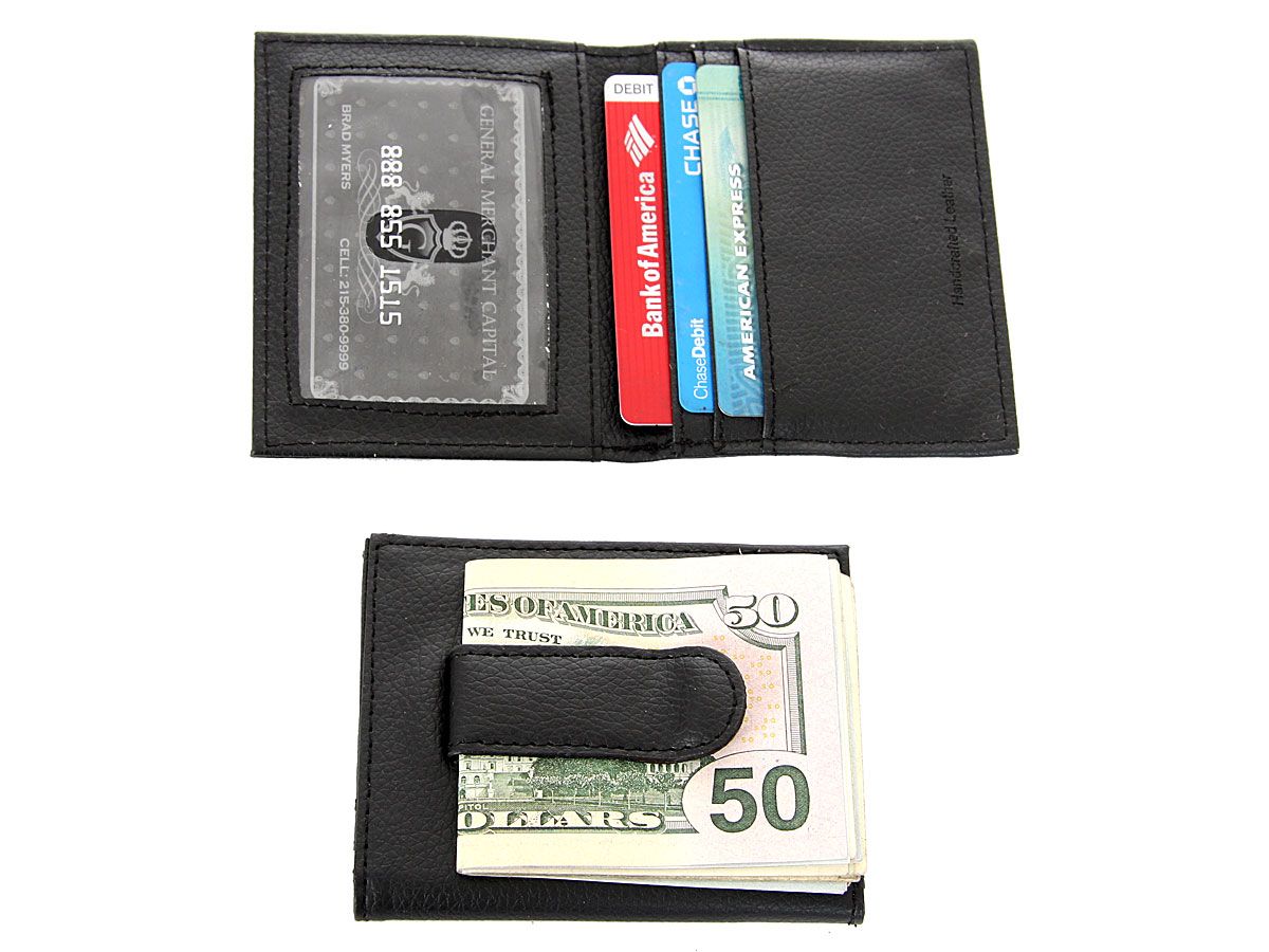 Carry your money in style. This is a leather (man-made) money clip wallet featuring 3 credit card slots, one ID window inside with flip open design. As this is genuine leather, please be aware that there will be some small creases and nicks in the leather but the wallet are all brand new.