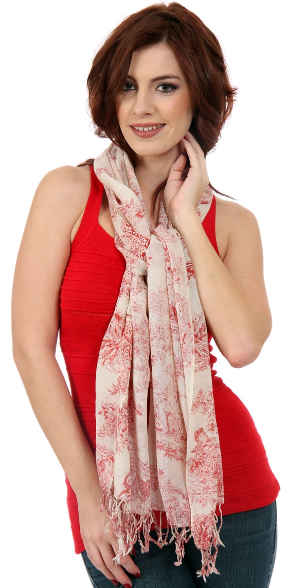 Red & White Garden Inspired Wool Scarf with Roman figures sitting under trees print. Twisted fringes at the edges.