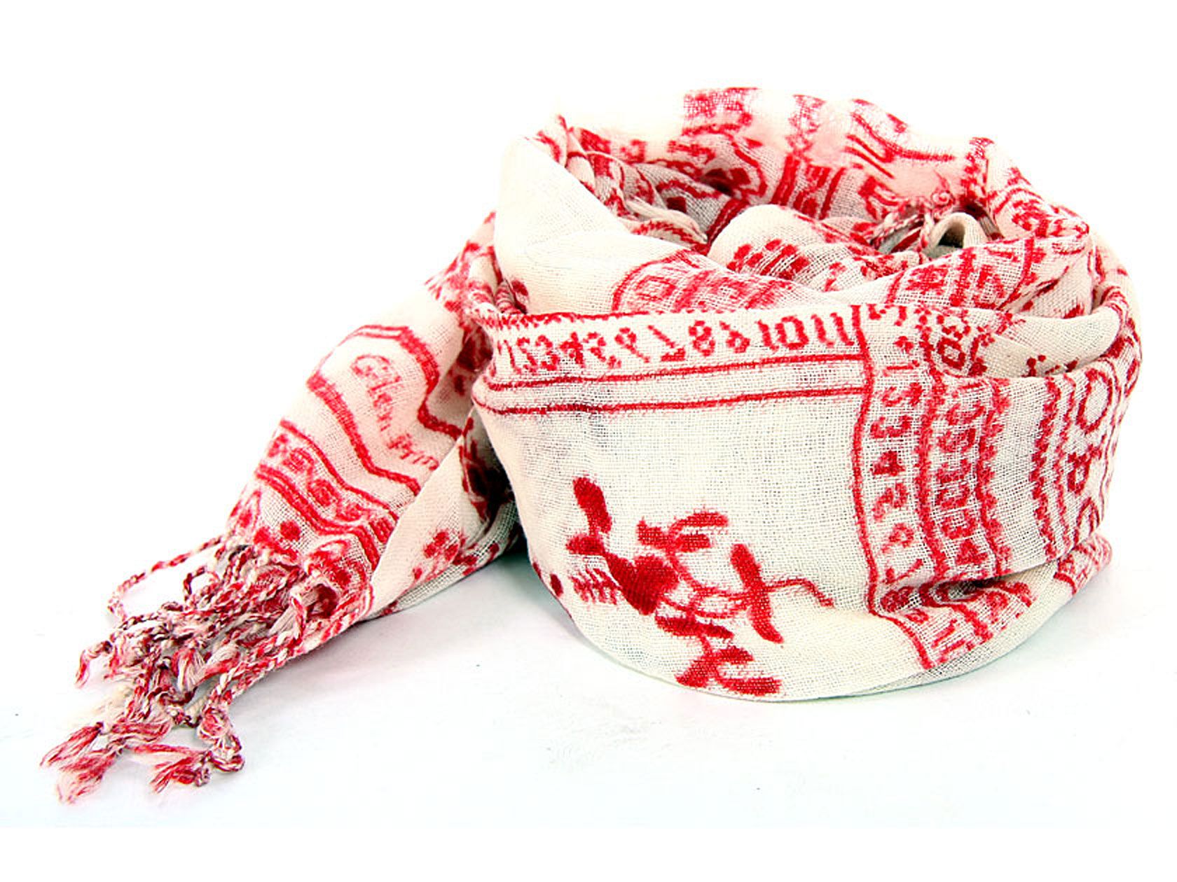Red & White 100% wool scarf with alphabets & numbers print in vertical & horizontal lines. Twisted Fringes at the edges. Imported. Dry clean only.