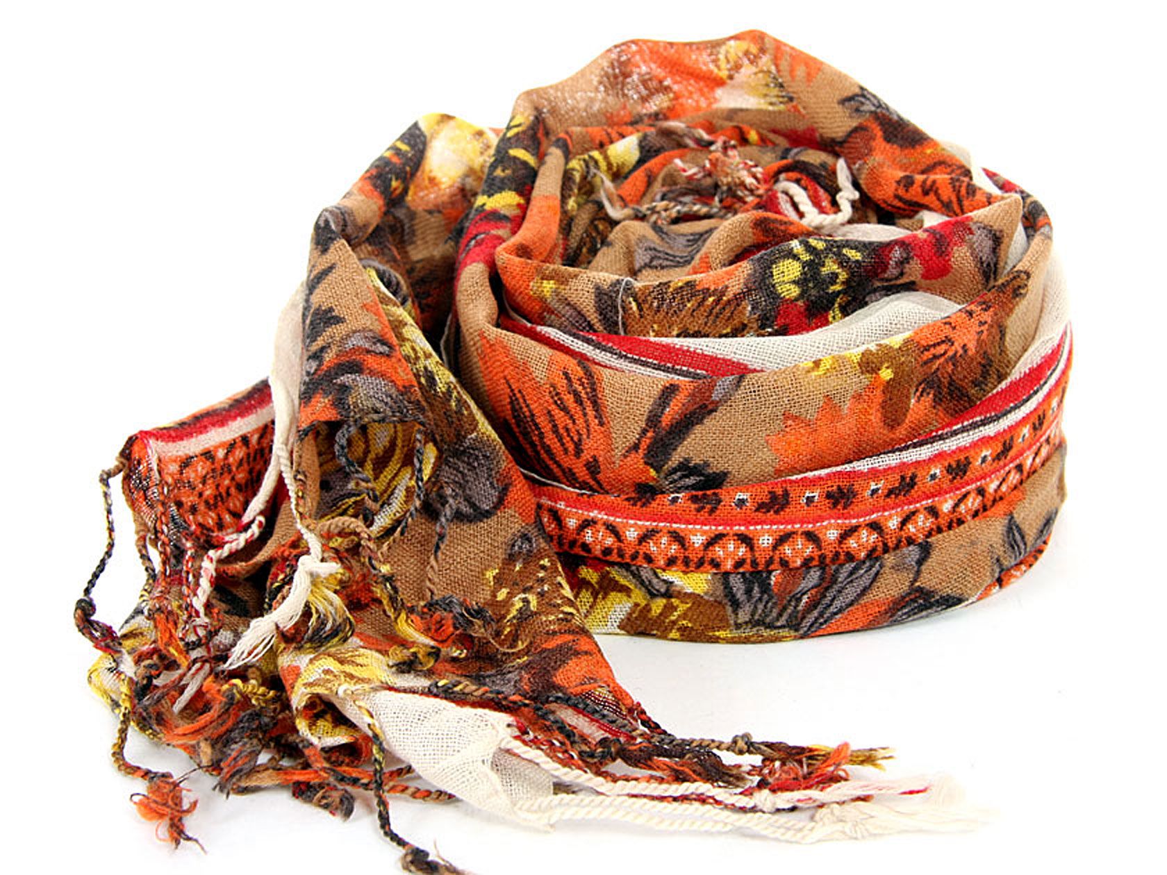 Orange Floral Print 100% wool scarf with multi-colored flowers and beige colored border. Hanging fringe at the edges. Imported. 100% wool.