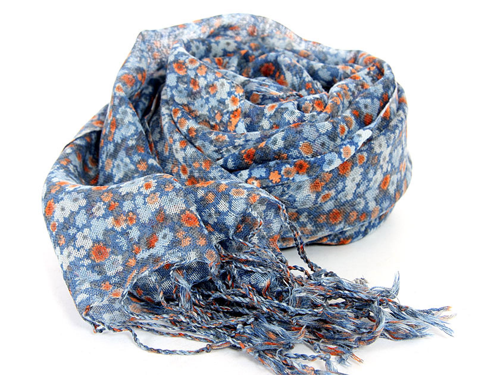 Light blue & orange colored miniature flowers blooms over this 100% wool weave of blue colored scarf finished with long twisted fringe at its ends. Imported. Dry clean only.