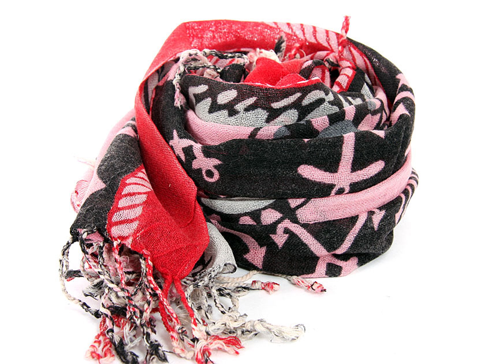 Nautical symbology floats over this 100% wool scarf in pink, red & black colors. The scarf has boats & anchors figure floating over with twisted fringes at the ends. Dry clean only. Imported.