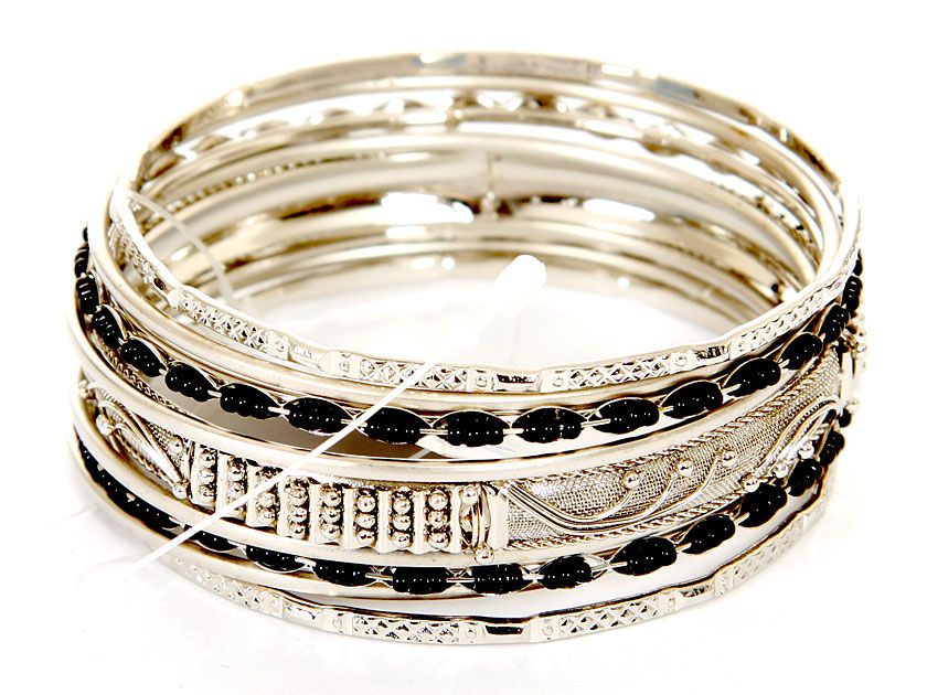 Metal Bangles Size: 2/10, (9 PCS Set) Silver Plating, Black Glass Beads work,(12 Sets in Box)