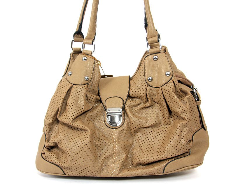 Fashion handbag has a mesh pattern texture, a double handle and a push lock closure. Made of PU (polyurethane).