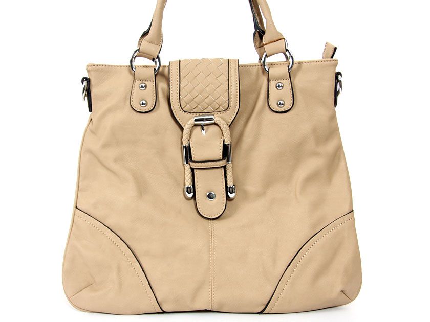 Convertible fashion handbag has a short double handle, a detachable shoulder strap, a top zipper closure with flap magnetic closing. Made of PU (polyurethane).