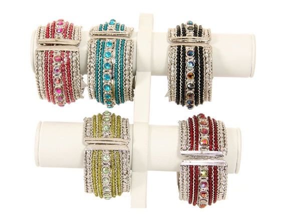 Metal Folding Bracelet,( 12 PCS in Box) Silver Plating, Kundan Work, Colors: Turquoise, Black, Crystal, Red, Fuchsia, Green (2 PCS each)