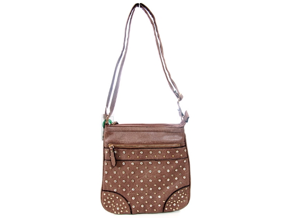 Faux Leather Metal studded messenger Bag. Front Pocket & top zipper closing. Back zipper pocket.