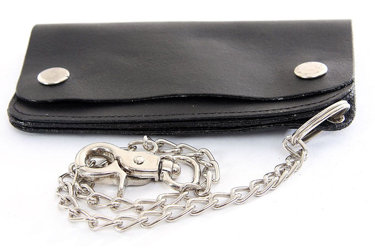 Carry your money in style. This is a genuine leather Biker wallet with steel chain. As this is genuine leather, please be aware that there will be some small creases and nicks in the leather but the wallet are all brand new.