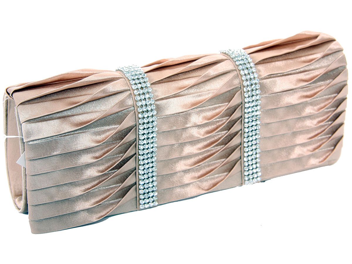 Satin Evening bag embellished with two Rhinestones strips. Magnetic snap button closing. Metal shoulder chain included.