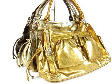 Trendy Metallic Shoulder Bag with top zipper closure, double shoulder straps, two side open pockets with drawstring closure & two front zipper pockets. Chain accents in the front. Made of PU (polyurethane).