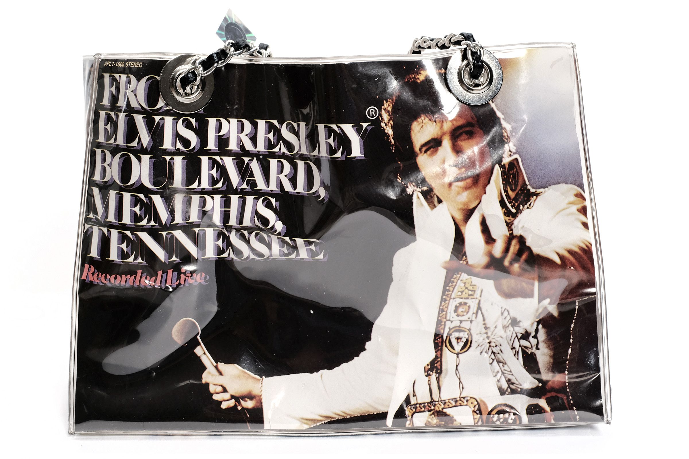 Elvis Presely Tote Handbag. With a magnetic closure made with vinyl material and has double handle.