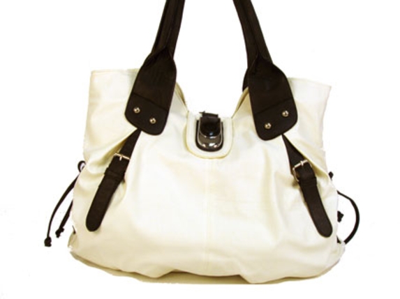 Pvc handbag with zipper accents in the front & straps like accents on the sides of the bag. Buckle as well as zipper closure on the top.