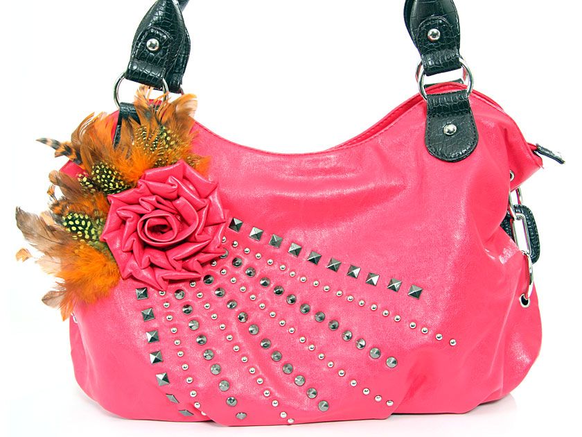 Faux Leather Feather/Rose flower studded bag. Top zipper closing. Back outside zipper pocket.
