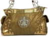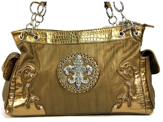 Fleur De Liz Licensed Handbag in Shining PVC. Top zipper closure bag has double handle with few links of chain also. Pockets with flap on the sides of the bag. Contrasting patchwork on the front corners & also in the center with fleur de liz logo in rhinestones.